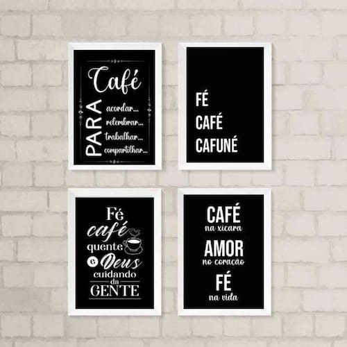 O Kit 4 Quadros Cantinho Do Café Com Fé é perfeito para decorar o seu ambiente com muito estilo e personalidade. Com moldura de madeira branca, esse kit traz charme e elegância para o seu quarto, sala, cozinha, escritório, área gourmet e muito mais.