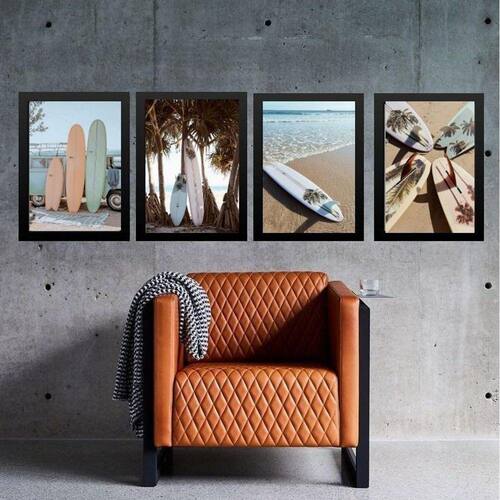 Kit 4 quadros coleção praia surf - pranchas 24x18cm - com vidro Moldura: madeira branca Informações do produto tire todas as suas dúvidas no descritivo abaixo: decoração para quarto, sala, cozinha, escritório, área gourmet e muito mais. Chega de paredes vazias medidas - cada peça tem 24x18cm a5 . Material do papel - papel fotográfico brilhante de altíssima resolução acabamento - todos os quadros são acompanhados de vidro para proteção da imagem. - moldura em madeira maciça na cor preta ou branca conforme produto escolhido e pendurador . - os quadros são embalados de forma segura com plástico bolha com camada dupla de acordo com o tamanho dos quadros. Garantia - garantia de 3 meses. Meu quadro chegou. Como posso fixá-lo Você precisa apenas de um martelo e um prego, pois os quadros já vão acompanhados de penduradores. Esta é a forma mais indicada. Como posso limpar meu quadro A limpeza é feita como um móvel comum da sua casa. Apenas um pano seco ou espanador são suficientes para tal