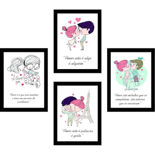 Kit 4 Quadros Com Moldura Frases Amor Namorados Especificações Técnicas: Desenvolvido em MDF de alta resistência; Estampa impressa em adesivo fosco; Ótimo para decoração de vários ambientes; Produto entregue em sua casa montado e embalado pronto para uso; Placas e quadros entregue com Fita Dupla Face de ótima qualidade, não há necessidade de furar; Não recomendado expor diretamente à luz do sol; Limpeza somente com pano seco. Um belo presente para seu namorado ou namorada, deixando um ambiente decorado e ainda mais bonito Importante: Garantia contra defeitos de fabricação. Todos os produtos postados em até 3 dias úteis Conteúdo da Embalagem: 1 unidades de Kit com 4 Quadros Com Moldura tema Frases Amor Namorados Contém 1 quadro com moldura tema amor é o que nos mantém a tona Contém 1 quadro com moldura tema amor não é algo é alguém Contém 1 quadro com moldura tema amor não é palavra é gesto Contém 1 quadro com moldura tema amor são metades que se completam Especificações Do Produto: Moldura: largura 2 cm, com espessura de 3mm Tamanho de cada quadro: Comprimento: 22,5 Cm Altura: 30,0 Cm Largura: 0,6 cm Marca: Alves&Alves Ean: 7897372128660