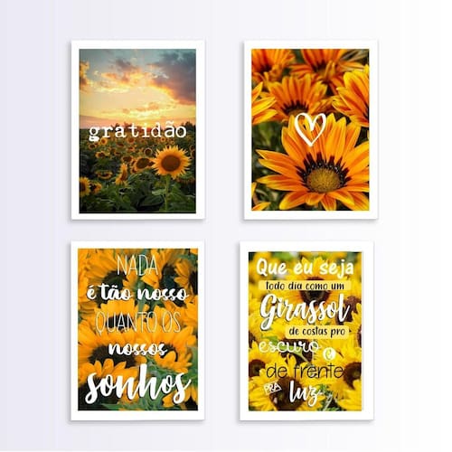 Kit 4 quadros decorativos girassóis 33x24cm - com vidro Moldura: madeira branca Informações do produto Decoração para quarto, sala, cozinha, escritório, área gourmet e muito mais. Chega de paredes vazias medidas - cada peça tem 33x24cm a4 . Material do papel - papel fotográfico brilhante de altíssima resolução Acabamento - todos os quadros são acompanhados de vidro para proteção da imagem. - moldura em madeira maciça e pendurador. - os quadros são embalados de forma segura com plástico bolha com camada dupla de acordo com o tamanho dos quadros. - de 3 meses. Meu quadro chegou. Como posso fixá-lo Você precisa apenas de um martelo e um prego, pois os quadros já vão acompanhados de penduradores. Esta é a forma mais indicada. Como posso limpar meu quadro A limpeza é feita como um móvel comum da sua casa. Apenas um pano seco ou espanador são suficientes para tal