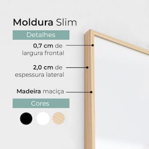 No Modelo Com Vidro: Moldura Slim Madeira Maciça de 0,7cm de largura frontal e 2cm de espessura lateral