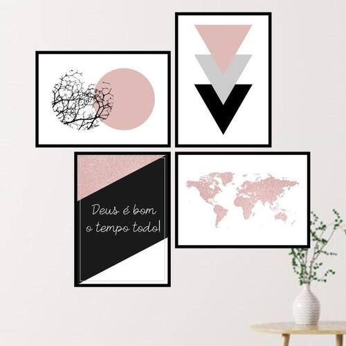 Kit 4 quadros geométricos com frase deus 24x18cm - com vidro Moldura: madeira preta Informações do produto tire todas as suas dúvidas no descritivo abaixo: decoração para quarto, sala, cozinha, escritório, área gourmet e muito mais. Chega de paredes vazias medidas - cada peça tem 24x18cm a5 . Material do papel - papel fotográfico brilhante de altíssima resolução acabamento - todos os quadros são acompanhados de vidro para proteção da imagem. - moldura em madeira maciça na cor preta e pendurador . - os quadros são embalados de forma segura com plástico bolha com camada dupla de acordo com o tamanho dos quadros. - de 3 meses. Meu quadro chegou. Como posso fixá-lo Você precisa apenas de um martelo e um prego, pois os quadros já vão acompanhados de penduradores. Esta é a forma mais indicada. Como posso limpar meu quadro A limpeza é feita como um móvel comum da sua casa. Apenas um pano seco ou espanador são suficientes para tal Marca: Não Informado