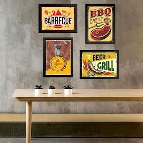 Kit 4 quadros placas vintage churrasco 45x34cm - com vidro Cor: moldura preta Informações do produto tire todas as suas dúvidas no descritivo abaixo: decoração para quarto, sala, cozinha, escritório, área gourmet e muito mais. Chega de paredes vazias medidas - cada peça tem 45x34cm a3 . Material do papel - papel fotográfico brilhante de altíssima resolução acabamento - todos os quadros são acompanhados de vidro para proteção da imagem. - moldura em madeira maciça na cor preta ou branca conforme produto escolhido e pendurador . - os quadros são embalados de forma segura com plástico bolha com camada dupla de acordo com o tamanho dos quadros. Garantia - garantia de 3 meses. Meu quadro chegou. Como posso fixá-lo Você precisa apenas de um martelo e um prego, pois os quadros já vão acompanhados de penduradores. Esta é a forma mais indicada. Como posso limpar meu quadro A limpeza é feita como um móvel comum da sua casa. Apenas um pano seco ou espanador são suficientes para tal