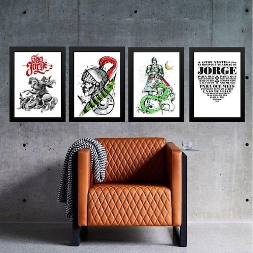 Kit 4 quadros são jorge com oração 45x34cm - com vidro Moldura: madeira branca Informações do produto tire todas as suas dúvidas no descritivo abaixo: decoração para quarto, sala, cozinha, escritório, área gourmet e muito mais. Chega de paredes vazias medidas - cada peça tem 45x34cm a3 . Material do papel - papel fotográfico brilhante de altíssima resolução acabamento - todos os quadros são acompanhados de vidro para proteção da imagem. - moldura em madeira maciça na cor preta ou branca conforme produto escolhido e pendurador . - os quadros são embalados de forma segura com plástico bolha com camada dupla de acordo com o tamanho dos quadros. Garantia - garantia de 3 meses. Meu quadro chegou. Como posso fixá-lo Você precisa apenas de um martelo e um prego, pois os quadros já vão acompanhados de penduradores. Esta é a forma mais indicada. Como posso limpar meu quadro A limpeza é feita como um móvel comum da sua casa. Apenas um pano seco ou espanador são suficientes para tal