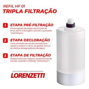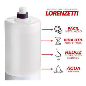 Kit com 4 refis compatíveis com purificadores Lorenzetti Acqua Bella e Vitale. Proporciona tripla filtração (polipropileno, carvão ativado, polipropileno de clarificação). Remove cloro, sabores indesejáveis, partículas de sujeira e 96% dos micróbios.Tipo
