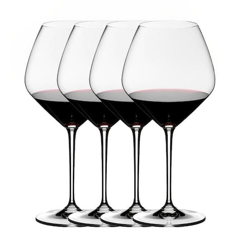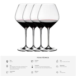 Kit 4 Taças Riedel Extreme Pinot Noir Vinho Cristal Copo Top A Riedel foi a primeira a reconhecer que o sabor da bebida muda conforme a taça em que é servida. Por isso: Se você quer beber vinhos diferentes, deve ter taças diferentes As taças da linha Extreme são indicadas para vinhos do Novo Mundo e a taça Pinot é perfeita para vinhos tintos de corpo leve, com alta acidez e tanino moderado. País: ÁustriaProdutor: RiedelTipo: Taças / Copos de CristalDimensões: 24,3cm de alturaCapacidade: 770mlMaterial: CristalCor: TransparenteUva: Ideal degustar vinhos das variedades Pinot Noir e Nebbiolo e também espumantes especialmente Rosés . ConteúdoConjunto com 4 taças especiais para vinhos Pinot Noir da Linha Riedel Extreme