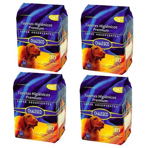 Kit 4 Tapetes Higiênico Chalesco C/30 Unidades - Indicado para cães; - Possui gel super absorvente; - Com barreira anti - vazamento; - Contém atrativo canino; - Fitas adesivas para fixação; - Tamanho 90 x 60cm; - Kit com 4 pacotes de 30 unidades cada. Neste Kit 4 Tapetes Higiênico Chalesco você aproveita a praticidade e garante 120 unidades de tapete higiênico com um preço super acessível. O Tapete Higiênico para Cães Chalesco apresenta poderoso gel absorvente que mantém o ambiente limpo, seco e sem odores desagradáveis. Ele imita a textura de um gramado artificial, oferecendo mais conforto aos animais. Além disso, o tapete possui adesivos para prender no chão ou na parede. Além disso, é confeccionado em materiais resistentes, com barreiras anti-vazamentos especiais, que impedem os vazamentos de fezes.