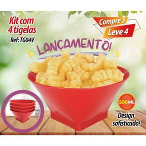 Kit 4 tigela pote plástico cumbuca petiscos sobremesa 500ml Cor: vermelho Nosso empenho é procurar o que há de mais atual e funcional no mundo culinário e para organização da sua casa, priorizando sempre a qualidade e a versatilidade dos produtos. Kit 4 tigelas potes de plástico O kit com 4 tigelas é perfeito para servir petiscos, entradas, sobremesas, pequenas porções de saladas, caldos e muito mais Seu design apresenta uma base quadrada, que além de moderno, agrega ainda mais sofisticação a sua mesa As tigelas tem uma capacidade de 500ml, fabricadas em material resistente e livre de bpa, podendo ser levadas ao freezer e micro-ondas, auxiliando também no preparo de suas receitas.Disponível nas cores: branco, preto e vermelho, são 4 peças para você utilizar com a praticidade que você precisa. Medidas: Base quadrada: 6,5 cm x 6,5 cmDiâmetro superior: 14 cmAltura: 8 cmCapacidade: 500 ml Material:Polipropileno Conteúdo da embalagem:1 kit tigelas - 4 peças Gostou Esse pode ser seu aguardamos produto sua compra