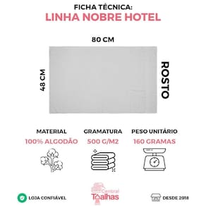 Características do produto: Medidas: 48cm x 80cm Peso: 160 Gramas Gramatura: 500 G/m Acabamento Hidrófilo para Aumentar Absorção Costura Dupla Reforçada Material: 90% Algodão e 10% Poliéster Modelo: Hotel Luxo Nobre - Off White Garantia: Contra de Fabricação