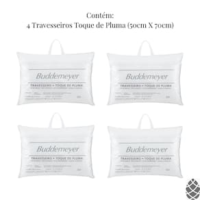 Travesseiros Toque de Pluma. A coleção de travesseiros Toque de Pluma da Buddemeyer garante conforto e aconchego para o seu momento de descanso. Produto não alérgico, extra macio e de alta durabilidade com detalhe requintado. Produzidos em 100% algodão cetim 233 fios com acabamento especial, tem seu enchimento em 100% poliéster microfibra extra macia. Os travesseiros podem ir à máquina sempre que for necessário, oferecendo a higienização perfeita. A Buddemeyer é referência em qualidade e estilo.