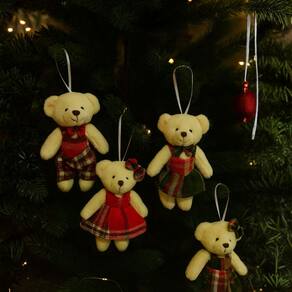 Deixe sua decoração natalina ainda mais charmosa com o Kit 4 Ursinhos de Pelúcia Pendente 15cm, produzido em pelúcia creme prime de alta qualidade e vestidos com roupas xadrez vermelho e verde, garantindo um visual clássico e encantador.