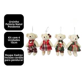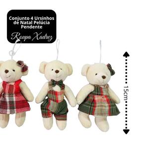 Deixe sua decoração natalina ainda mais charmosa com o Kit 4 Ursinhos de Pelúcia Pendente 15cm, produzido em pelúcia creme prime de alta qualidade e vestidos com roupas xadrez vermelho e verde, garantindo um visual clássico e encantador.