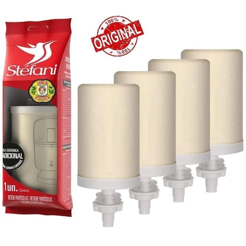 Kit 4 velas refis filtro barro stéfani são joão tradicional Descrição: Vela tradicional stéfani/são joão para filtro de barro Marca: stéfani Modelo: vela cerâmica tradicional Troca: 500 litros ou 6 meses Composição básica: cerâmica branca, ps, pvc e hot melt. Comprimento aproximado: 14cm Diâmetro aproximado: 7cm Características: Tradicional - feita de cerâmica microporosa, filtra e retém as partículas sólidas em suspensão na água, deixando-a cristalina. Descrição: Só mesmo a empresa líder do setor poderia fabricar uma das melhores velas do mundo. Além dos filtros stéfani terem sido os primeiros a receber o certificado do inmetro, a vela stéfani é considerada uma das mais eficientes do mundo no tratamento da água. Sua parede em material cerâmico micro-poroso filtra a água por gravidade, sem adição de produtos químicos, reduzindo impurezas e retendo partículas sólidas, o que garante uma água saudável e livre de microrganismos. As velas stéfani são compatíveis com todos os filtros por gravidade do mercado, sem dúvida, não há meio mais seguro de oferecer água pura e garantir saúde e bem-estar. Produto novo com nota fiscal