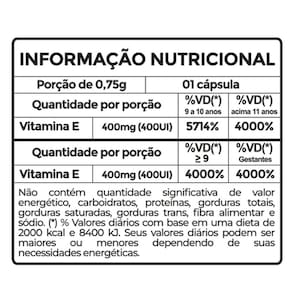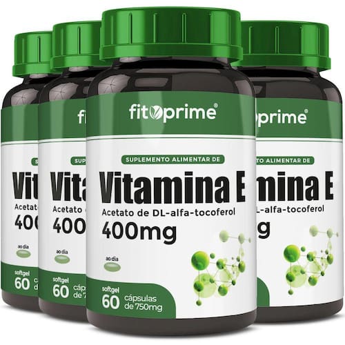 Kit 4 potes de Vitamina E 400mg 60 Cápsulas FitoprimeA vitamina E é um antioxidante que auxilia na proteção dos danos causados pelos radicais livres.Ingredientes:Acetato de DL-alfa-tocoferol e óleo de girassol. Composição da cápsula: gelatina, água purificada, umectante glicerina e corante natural clorofila. NÃO CONTÉM GLÚTEN.Sugestão de uso:Ingerir 1 cápsula ao dia.Conservação:Após aberto, manter a embalagem bem fechada e armazenar em local fresco, seco e ao abrigo de luz.Produto lacrado para sua proteção. Não utilizar em caso de violação. Manter fora do alcance de crianças.produto Dispensado de Registro Conforme RDC 240/2018.
