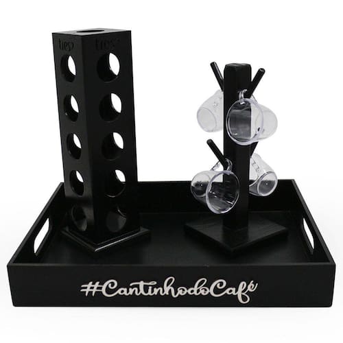Kit 4 xicaras acrílico cristal porta capsulas para 3 corações bandeja Composição do kit;4 xícaras1 bandeja1 suporte de xícaras1 porta capsulas para 3 corações Xícara 85ml acrílica transparente As xícaras são muito bonitas e esse acrílico cristal traz um charme a mais ao produto, deixando-o ele mais decorativo para a hora do café. Você pode usar em casa ou no escritório, ter sempre à mão sua xícara para tomar aquele cafezinho, capuccino e até um chocolate quente se estiver com vontade. Capacidade 85mlMaterial - acrílicoAltura - 5,5 cmLargura - 8,5 cm Bandeja cantinho do café versátil e multiuso Feita em mdf de 6mm com pintura em tinta acrílica na cor preta ela é ideal para organizar o seu lar, servir um cafezinho para os amigos, organizar papeis de escritório entre diversas outras utilidades. Bandeja versátil de qualidade, combinando com todos os ambientes no qual estiver Suas medias são40x30x6 externa 38,5 x 28,5 x 5,5 na parte interna Possui as laterais vazadas como uma alça. Suporte porta xícara caneca 4 pinos xicaras Esse é o produto ideal para decorar o seu tão especial cantinho do café ou até mesmo presentear uma pessoa querida, além da beleza o porta xicaras é feito em mdf que é muito resistente, ideal para xicaras/canecas de 240ml. Com esse porta xicaras você vai conseguir deixar seus armários muito mais organizados. Medidas suporte:Altura: 24 cmBase: 11x11Peso: 282gMaterial de composição: mdf/pinus Porta cápsula para cápsulas 3 corações Esse porta cápsulas tem ar moderno feito em madeira mdf pintada de preto, dando um ar de elegância para qualquer canto de sua casa. Organize seu cantinho do café com as cápsulas sempre a mão e ainda decore o seu ambiente com certeza vai ser uma peça que vai chamar a atenção e tirar elogios Feito em mdf com pintura preta tinta acrílica Comporta 20 capsulas 3 coraçõesMedidas 32x11x11 Cápsulas não inclusas Perguntas frequentes: - entregam para todo país Quem somos Marca: Dupétriz