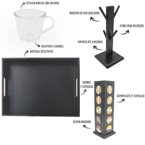 Kit 4 xicaras acrílico cristal porta capsulas para 3 corações bandeja Composição do kit;4 xícaras1 bandeja1 suporte de xícaras1 porta capsulas para 3 corações Xícara 85ml acrílica transparente As xícaras são muito bonitas e esse acrílico cristal traz um charme a mais ao produto, deixando-o ele mais decorativo para a hora do café. Você pode usar em casa ou no escritório, ter sempre à mão sua xícara para tomar aquele cafezinho, capuccino e até um chocolate quente se estiver com vontade. Capacidade 85mlMaterial - acrílicoAltura - 5,5 cmLargura - 8,5 cm Bandeja cantinho do café versátil e multiuso Feita em mdf de 6mm com pintura em tinta acrílica na cor preta ela é ideal para organizar o seu lar, servir um cafezinho para os amigos, organizar papeis de escritório entre diversas outras utilidades. Bandeja versátil de qualidade, combinando com todos os ambientes no qual estiver Suas medias são40x30x6 externa 38,5 x 28,5 x 5,5 na parte interna Possui as laterais vazadas como uma alça. Suporte porta xícara caneca 4 pinos xicaras Esse é o produto ideal para decorar o seu tão especial cantinho do café ou até mesmo presentear uma pessoa querida, além da beleza o porta xicaras é feito em mdf que é muito resistente, ideal para xicaras/canecas de 240ml. Com esse porta xicaras você vai conseguir deixar seus armários muito mais organizados. Medidas suporte:Altura: 24 cmBase: 11x11Peso: 282gMaterial de composição: mdf/pinus Porta cápsula para cápsulas 3 corações Esse porta cápsulas tem ar moderno feito em madeira mdf pintada de preto, dando um ar de elegância para qualquer canto de sua casa. Organize seu cantinho do café com as cápsulas sempre a mão e ainda decore o seu ambiente com certeza vai ser uma peça que vai chamar a atenção e tirar elogios Feito em mdf com pintura preta tinta acrílica Comporta 20 capsulas 3 coraçõesMedidas 32x11x11 Cápsulas não inclusas Perguntas frequentes: - entregam para todo país Quem somos Marca: Dupétriz