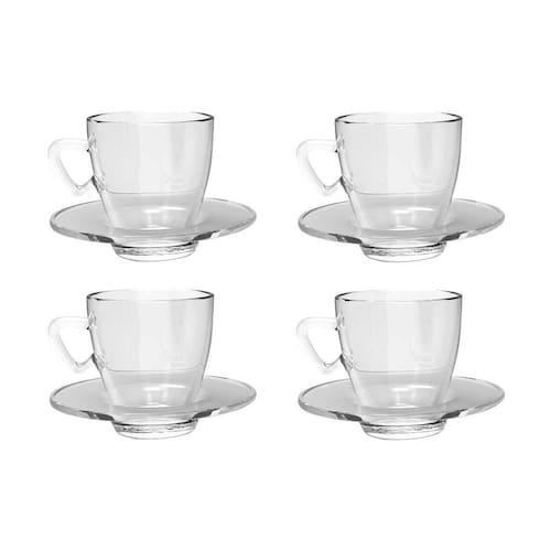 Conjunto de Xícaras de 220ml Conjuntos de xícaras e pires transparentes de 90ml são uma escolha popular para servir bebidas quentes como café e chá. Possuem um design simples e elegante. Feitos de vidro transparente de alta qualidade, essas xícaras permitem que você veja a cor e a textura de sua bebida, tornando-a uma experiência visualmente agradável. O tamanho de 90ml é perfeito para uma dose individual de café ou chá, tornando esses conjuntos ideais para uso doméstico ou para servir pequenas reuniões.