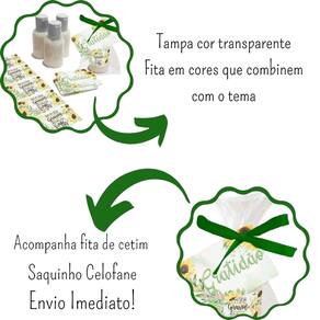 As garrafinhas já vêm cheias, e os rótulos, tags, saquinhos e fitas são enviados separadamente.