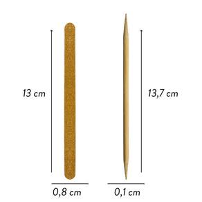 combinação perfeita e indispensável para manter suas unhas limpas, saudáveis e bem modeladas. O kit inclui um conjunto para atender às diferentes necessidades das unhas. A lixa parda arte sedução conta com uma excelente durabilidade, utilizada para lixar, arredondar as bordas, dar formato, corrigir imperfeições nas extremidades e suavizar as superfícies das unhas, deixando-as menos propensas a quebrar ou partir. Possui dois tipos de gramatura: grossa de um lado para desbaste e fina do outro para acabamento. O palito de bambu ponta dupla, possui em suas extremidades uma ponta fina muito resistente, ideal para auxiliar em correções , limpeza e remoção de sujeiras acumuladas nas unhas, podendo ser utilizado também para fazer desenhos artísticos. Seu material de bambu é naturalmente resiste a bactérias e fungos, o que a torna uma escolha saudável para os procedimentos. - durabilidade; - produtos versáteis; - ou doméstico; - tamanho prático para carregar na bolsa ou necessaire. Especificações: dimensões do palito: 13,7 x 0,1 cm dimensões da lixa: 13 x 0,8 cm quantidade: 400 palitos e 400 lixas