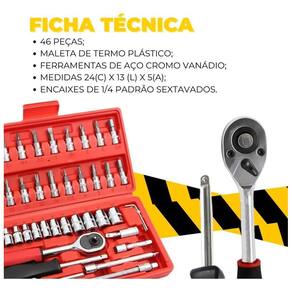 Especificações Técnicas: Marca: Tippi Quantidade de peças: 46 Material da maleta: Termo plástico leve e resistente Material das ferramentas: Aço cromo vanádio Tipo de encaixe: 1/4 padrão sextavado Dimensões da maleta: 24 cm C x 13 cm L x 5 cm A Peso: Aproximadamente 1,2 kg Tipo de catraca: Reversível com Quick Release e 45 dentes