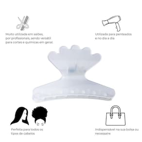 O kit ideal para uso diário pessoal e em salões de beleza A presilha formato sorriso é indispensável na sua rotina de cuidados com os cabelos, sendo perfeita para todos os tipos, confeccionada com dentes que não danificam os fios, ela é leve e compacta, sendo muito utilizada por profissionais em salões de beleza pela sua versatilidade em cortes e químicas em geral, seus dentes e formato são perfeitos para dividir e separar os cabelos. Um kit versátil, com ótimo custo benefício