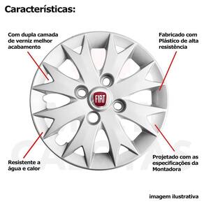 Calota em Plástico de Alta resistência, Fabricado pela Grid Calotas com os mesmos padrões e exigências da montadora. Com logotipo incluso. Jogo de Calotas para a linha Fiat com Roda de Ferro Aro 13. SERVE Fiat Uno - até 2013 Fiat Elba - Todos Fiat Premio - Todos Fiat Fiorino - até 2013 Fiat Palio - Todos Fiat Siena - até 2016 NÃO SERVE Fiat Strada - cubo de roda incompatível Fiat Palio Adventure - cubo de roda incompatível Fiat Nova Fiorino - cubo de roda incompatível Fiat Grand Siena - aro de roda maior CARACTERÍSTICAS: - Fabricado em Plástico Resistente - Com dupla camada de verniz - Resistente a água e calor - Feito de acordo com os padrões da montadora - Fixação: por Parafusos - Furação: 4x100 - Cubo: Baixo - Cor: Prata - Referência: 158CB - Marca: Grid Calotas ITENS INCLUSOS: - Um 1 Kit com quatro 4 calotas para Roda Aro 13 com Emblema Incluso. DIMENSÕES Unitário - Diâmetro: 37 cm - Altura: 4 cm INSTALAÇÃO A instalação é feita de forma simples, podendo ser feita por você mesmo. Não necessita retirar todos os parafusos. de 30 dias para defeitos de fabricação.