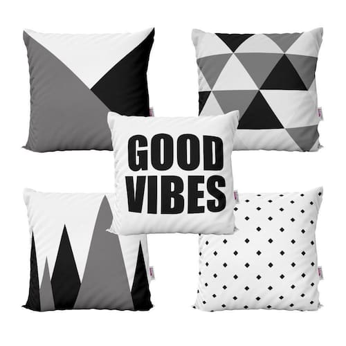 Kit 5 Almofadas Decorativas Preto E Branco Good Vibes 40X40Decorar sua casa com lindas Almofadas é aliar conforto e personalidade.E não existe sensação melhor do que poder chegar em casa depois de um dia cansativo de trabalho e curtir o aconchego do nosso lar.E por falar em aconchego, um item que transmite muito bem isso são as Almofadas Decorativas que você encontra na Novadecora.Se você é daqueles que adora decoração e gosta de deixar a sua casa com a sua personalidade, aqui na Novadecora é o lugar ideal para encontrar as almofadas mais lindas, dos mais variados estilos.Kit Com 5 Almofadas Decorativas em impressão digital com estampa exclusiva frente e versoTECIDOCapa confeccionada em tecido Oxford 100% poliéster, um tecido de ótima qualidade e durabilidade. O Oxford proporciona mais conforto e um toque agradável, além das cores ficarem mais vivas deixando seu ambiente mais decorado.Características e especificações:Marca: NovadecoraTecido: OxfordAlmofada já cheia Pronta para usoAlmofada lavável - sem perder a qualidade e impressãoFibra siliconizada anti-alérgica e anti-ácaroZíper invisívelDimensões lxa 40x40 cmConteúdo da embalagem 5 almofadas com enchimentosImportante sobre lavagem:- Lavar manualmente com sabão neutro- Temperatura máxima de lavagem 40°C. - Não usar alvejante. - Secar a sombra.- Temperatura máxima de base do ferro 110°C. - Não limpar a seco. Marca: Novadecora