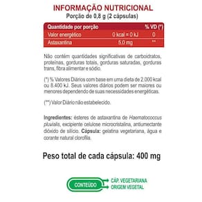 Ingredientes: Ésteres de Astaxantina, Excipiente Celulose Microcristalina, Antiumectante Dióxido de Silício. Cápsula: Gelatina Vegetáriana, Água e Corante Natural Clorofila.
