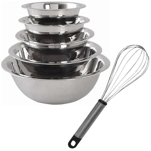 Kit 5 Bacias Tigela Em Inox 17,19, 21,23 e 25cm C/Fouet 24cm Kit contendo 5 Tigelas em inox nas medidas de 17, 19, 21, 23 e 25 cm + Fouet 24 cm