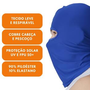 Capuz ajustável que cobre a cabeça e o pescoço, proporcionando proteção adicional contra os raios solares. Fácil de lavar e secagem rápida, dispensando o uso de amaciante e ferro de passar.