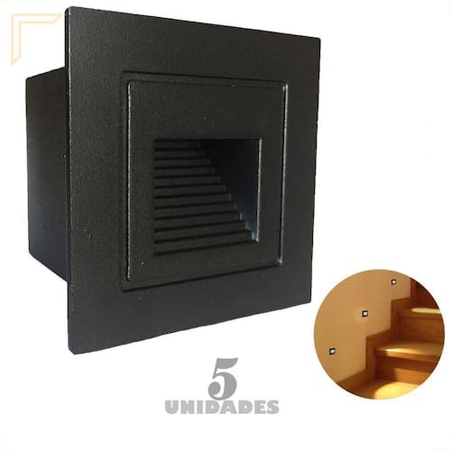 Kit 5 Balizador Externo Embutir Parede Preto Mini Escada Lup76 O balizador mini lup76 é ideal para iluminar caminhos externos ou internos. Embutido na sua escada, muro ou parede, se torna uma peça harmoniosa por conta da sua cor preto fosco texturizado e o seu tamanho mais sútil. Neste kit contem 05 balizador lup76.Descrição do balizador:- Material: Alumínio de alta qualidade- Led integrado incluso - Led: Vidro Temperado- Cor: Preto fosco texturizado- Dimensões:Comprimento: 5,8 cmAltura: 5,8 cmProfundidade: 4,6 cm Recorte:Comprimento: 4,3 cmAltura: 4,3 cmProfundidade: 4,3 cm- Potência: 3W- Temperatura de Cor: 3000K- Tensão: Bivolt 110V - 220V - Grau de Proteção: IP65- Facho: 1 Não necessita de lâmpada.