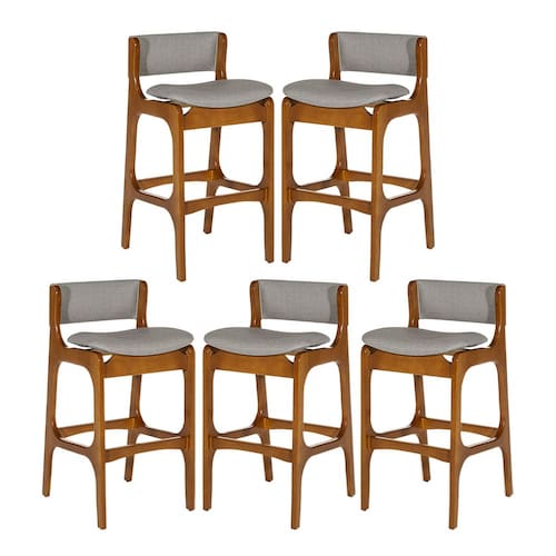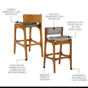 Se você está procurando uma banqueta que se destaque em todos os ambientes, precisa conhecer a Banqueta Ella. Com um design clássico, ela vai se adequar perfeitamente as suas necessidades do dia a dia. A Banqueta Ella é perfeita para ser utilizada em diversos espaços, como a bancada da cozinha americana, balcões altos em espaços gourmet, mesas bistrô no cantinho do churrasco e muito mais. Ela traz estilo e funcionalidade para qualquer ambiente. Produzida com materiais de excelente qualidade, a Banqueta Ella garante maior durabilidade e resistência. Não perca mais tempo procurando a banqueta perfeita e venha conhecer nosso catálogo para deixar sua casa mais completa e cheia de estilo com todos os produtos da Rio Madeira Interiores. CARACTERÍSTICAS TÉCNICAS: - Produzido em Madeira Maciça Sustentável - Acabamento em Verniz na cor Castanho - Assento e Encosto Estofado Preenchido com Espuma D23 - Revestido em Tecido Impermeável na cor Cinza Claro L96 - Banqueta Entregue Montada *Kit Composto por CINCO Banquetas INFORMAÇÕES TÉCNICAS: Altura Total: 96 cm Altura Chão até Assento: 75 cm Largura Total: 46 cm Largura do Assento: 50 cm Profundidade Total: 55 cm Profundidade Assento: 40 cm Peso: 10 kg INFORMAÇÕES ADICIONAIS: Garantia para defeitos de fabricação conforme Código de Defesa do Consumidor. - Produto em madeira maciça natural, podendo ocorrer variação no tom ou cor da madeira. - As imagens ambientadas são meramente ilustrativas e podem apresentar itens que não compõe o produto, as cores do produto podem variar de acordo com o monitor, a iluminação do ambiente ou sua percepção visual. - Limpeza: Deve ser feita com pano macio e seco ou levemente umedecido com água e sabão neutro. Não devem ser utilizados abrasivos. Marca: Não Informado