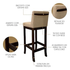 CARACTERÍSTICAS TÉCNICAS: - Produzido em Madeira Maciça; - Acabamento em Verniz na cor Capuccino; - Assento Preenchido com Espuma D26; - Encosto Preenchido com Espuma D23; - Revestimento em Tecido Suede na cor Bege.