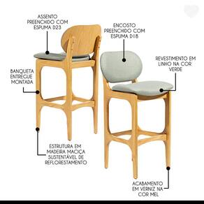 Kit de Banquetas Alta Decor é o modelo ideal para complementar o seu ambiente. Dispõe de um design atual com assento e encosto estofado dando um conforto único ao móvel. As banquetas são móveis versáteis que podem ser utilizados em diversos ambientes e funcionalidades, petindo composições na decoração e agregando conforto e sofisticação ao ambiente. Podem ser utilizadas em bancadas de salas conjugadas, mesas bistrô em sacadas gourmet ou aonde você precisar. Produzida com madeira maciça, garantindo a sua durabilidade e vida útil. CARACTERÍSTICA TÉCNICAS: - Produzido em Madeira Maciça - Acabamento em Verniz na cor Mel - Assento Estofado Preenchido com Espuma D23 - Encosto Estofado Preenchido com Espuma D18 - Tecido de Alta Qualidade em Linho na cor Verde L84 - Banqueta Entregue Montado * Kit Composto por CINCO Banquetas INFORMAÇÕES TÉCNICAS: - Altura Total: 104 cm - Altura até o Assento: 75 cm - Largura Total: 50 cm - Profundidade Total: 54 cm Informações Adicionais: Garantia para defeitos de fabricação conforme Código de Defesa do Consumidor. *ATENÇÃO: Não nos responsabilizamos pela montagem, subir ou içar o móvel. *As imagens ambientadas são meramente ilustrativas e podem apresentar itens que não compõe o produto, as cores do produto podem variar de acordo com o monitor, a iluminação do ambiente ou sua percepção visual. *Limpeza: Deve ser feita com pano macio e seco ou levemente umedecido com água e sabão neutro. Não devem ser utilizados abrasivos. Marca: Império das Banquetas