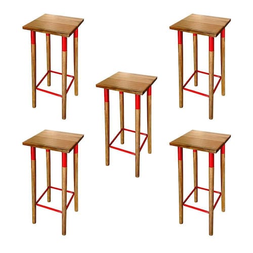 Kit 5 Banquetas Bistro Industrial Colors Ferro e Madeira Maciça - Vermelha - Marrom