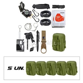 - Materiais: Tecido/Pano (Bolsa), Aço (Faca, cartão multifuncional, caneta e etc.), Plástico (Lanterna), Alumínio (Manta Térmica).