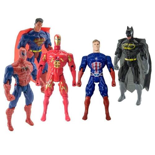 - 1 Boneco Articulado Homem Aranha 29cm1 Boneco Articulado Batman 29cm1 Boneco Articulado Super Homem 29cm1 Boneco Articulado Capitão América 29cm1 Boneco Articulado Homem de Ferro 29cm