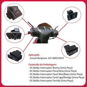 Kit 5 Botões Farol Pisca Buzina Seta Partida Burgman 125 O tem a função de informar o acionamento da buzina, embreagem, farol, freios, cavaletes, neutro, partida e pisca. Aplicação: - Suzuki Burgman 125 Conteúdo da Embalagem: - 01 Botão Buzina Uma Peça - 01 Botão Pisca/Seta Uma Peça - 01 Botão Farol Alto/Baixo Uma Peça - 01 Botão Farol Liga/Desliga Uma Peça - 01 Botão Partida Uma Peça Características e benefícios - Conectores de alto padrão de qualidade aumentam a condutibilidade da peça - Acabamento resistente a variações climáticas aumenta a durabilidade da peça - Precisão dos acionamentos maior segurança na condução da motocicleta Marca: Não Informado