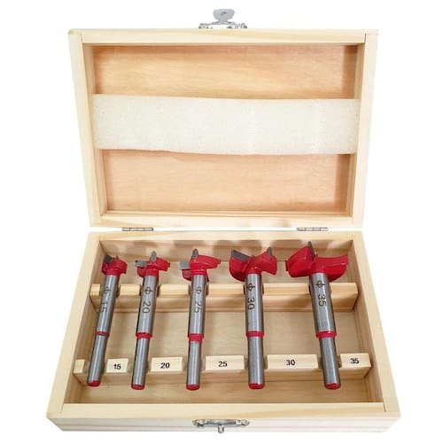 Kit com 5 brocas para dobradiças: 15mm, 20mm, 25mm, 30mm e 35mm. Em aço HSS, ideal para instalar dobradiças e outros encaixes em madeiras duras, aglomerados no segmento de móveis e carpintaria.