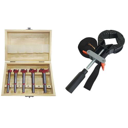 Kit 5 Brocas Forstner Fresa 15 a 35mm para Dobradiça +Grampo De Aperto Rápido 11'' Com Fita 4 Metros - CHARBS