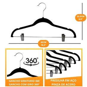 Revestimento Antideslizante: O veludo impede que as roupas escorreguem, mantendo tudo no lugar.Preservação do Formato das Peças: Curvas delicadas que evitam marcas e vincos indesejá Ultrafino: Maximiza o espaço no closet ou arara de roupas.Presilhas em Metal Cromado: Facilidade para pendurar calças, saias e bermudas com segurança.