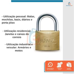 Os cadeados Papaiz são sinônimos de proteção e referência mundial de qualidade. Produzidos com matérias-primas de primeiríssima qualidade garante grande resistência e durabilidade, mesmo em ambientes úmidos. Seu corpo feito em latão maciço, possui haste reforçada (cementada e temperada) e acabamento cromado que aumenta a resistência ao corte.