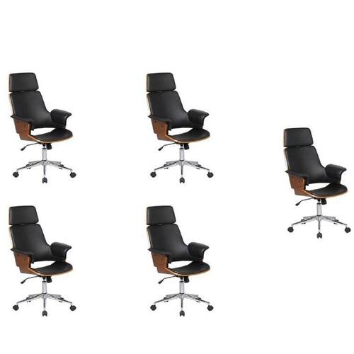 Cadeira office com assento em madeira compensada, revestido em poliuretano (PU) com preenchimento em espuma. Mecanismo com funções up-down e relax. Braços fixos. Base cromada com 320mm diâmetro em formato estrela, com rodízios. Altura do Conjunto: 121 cm Ambiente: null Ambiente Principal: Escritório Cor: Preto Informação Complementar: 5x Cadeira de Escritório Presidente em Sintético e Madeira Coimbra Preto Largura: 67 cm Altura: 121 cm Peso: 15 kg Profundidade: 68 cm Necessita Montagem: Sim