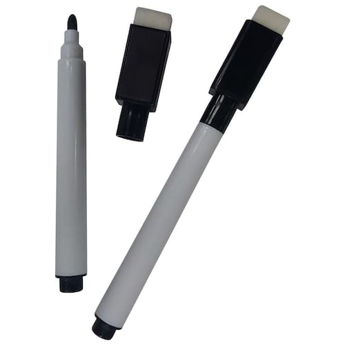 5 Canetas Para Quadro Branco Com Apagador E Imã Cor da tinta: Preto Todas as canetas possuem a tinta e a tampa de cor preta, na ponta da tampa encontra-se uma espuma para apagar e na lateral um imã que permite que grudem em superfícies metálicas.