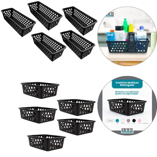 Kit 5 Cesto Multiuso Comprido Retangular e 5 Cesto médio Cesto Multiuso Comprido Retangular Preto 123 Organizei Os Cestos Multiuso 123Organizei, são muito charmosos e discretos. Podem ser em armários, gavetas, guarda roupas e até mesmo em banheiro. MEDIDAS: Altura: 8,00cm Largura: 11,00cm Comprimento: 28,00cm 123organizei ------------------------------------------------------------ CESTO PRETO Médio 123ORGANIZEI Cor PRETO Medidas 20x15,5x6,5Cm Material PLástico Marca 123Organizei Marca: Não Informado Ean: 7904692573558