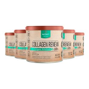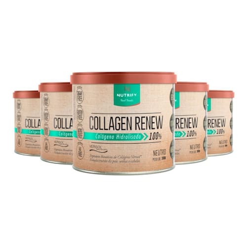 Kit 5 collagen renew colágeno hidrolisado nwutro nutrify 300g Benefícios: fortalecimento da pele, unhas e cabelos. A firmeza e a sustentação de nossa pele estão diretamente relacionadas à produção de colágeno pelo organismo, que diminui progressivamente ao longo dos anos, ocasionando flacidez e outros sinais de envelhecimento. À base de colágeno hidrolisado, a fórmula de collagen renew nutrify também 2,5 g de peptídeos bioativos de colágeno verisol em cada porção, ajudando a recuperar a firmeza dos tecidos, melhorando sua aparência. Collagen renew nutrify é isento de açúcar, lactose, glúten, corantes e adoçantes artificiais, e conta com adição de vitaminas e minerais antioxidantes, que favorecem a absorção dos peptídeos e promovem o fortalecimento de unhas e cabelos. Nutrify valoriza a origem de cada ingrediente, respeita a integridade de suas fontes naturais e dos envolvidos em sua produção. É assim que criamos produtos saudáveis e saborosos, que fazem bem para as pessoas e para o planeta. Acreditamos que nutrir corpo e mente de modo saudável nos torna capazes de alimentar o mundo com atitudes positivas. Ingredientes: colágeno hidrolisado, colágeno hidrolisado bioativo verisol e mix de vitaminas e minerais vitamina c ácido ascórbico , vitamina e dl alfa-acetato de tocoferol , zinco sulfato de zinco mono-hidratado , vitamina a acetato de retinol , cromo picolinato de cromo , selênio selenito de sódio , vitamina h biotina e vitamina d colecalciferol . Não contém glúten. Apresentação: embalagem disponível: lata contendo suplemento em pó. Sabor neutro. Peso líquido: 300 g produto classificado como: pó para o preparo de bebida à base de peptídeos de colágeno com adição de vitaminas e minerais sabor neutro. Marca: Não Informado