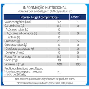 Kit 5 Colágeno Verisol + Vitamina C Catarinense 60 cápsulas RECOMENDAÇÃO DE USO: Recomenda-se ingerir 3 comprimidos ao dia. Este produto é indicado para indivíduos adultos maiores de 19 anos. Este produto não é um . Não exceder a recomendação diária de consumo indicada na embalagem. Mantenha fora do alcance de crianças. Este produto não deve ser consumido por gestantes, lactantes e crianças. Guardar o produto à temperatura ambiente entre 15C e 30C , ao abrigo da luz, bem fechado e protegido da umidade. Se o lacre estiver violado, recuse o produto. Contém dessecante à base de sílica. Ingredientes: peptídeos bioativos de colágeno hidrolisado com peso molecular médio de 2kDa, amido modificado, ascorbato de sódio, agente de massa celulose microcristalina INS 460i , estabilizante croscarmelose sódica INS 468 , glaceantes: álcool polivinílico INS 1203 , talco INS 553iii , hidroxipropilmetilcelulose INS 464 ; corantes: dióxido de titânio INS 171 , óxido de ferro amarelo INS 172iii , laca de alumínio com amarelo de quinoleína. Dispensado de registro conforme Resolução RDC 27/2010. este produto é indicado para indivíduos com 19 anos ou mais. Este produto não é um . Não exceder a recomendação diária de consumo indicada na embalagem. Mantenha fora do alcance de crianças. Este produto não deve ser consumido por gestantes, lactantes e crianças. NÃO CONTÉM GLÚTEN. Marca: Não Informado Ean: 7908609538845