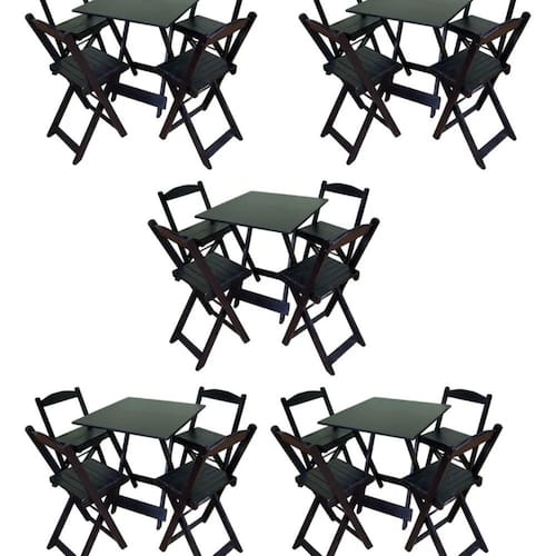 Peso: 4,15kg Medida da Mesa (A x L x P): 75x70x70 Peso da Mesa: 10 kg Mesa suporta até: 50 kg Acabamento da Cadeira/Banco: Pintura Acabamento da Mesa: Verniz Ambiente Principal: Jardim e Varanda Cadeira/Banco Estofada: Não Cadeira/Banco estofada: Não Cadeira/Banco Suporta Até: 150.0000 Cadeira/Banco suporta até: 150 kg codigo_ean: 7900288263629 Cor: Preto Cor do Produto: Preto Escala de Brilho: Semi-Brilho Espessura do Tampo: 15 mm Estrutura do Assento: Madeira Itens Inclusos: 5 Mesas e 20 Cadeiras Manual de Montagem e Instalação: https://product-hub-prd.madeiramadeira.com.br/570294127/documents/2998d373-65bb-43b3-900e-f5cddee7a9433269154667617601006896008.pdf Marca: MÓVEIS 4I Material da Base da Mesa: Madeira Material da Estrutura da Cadeira: Madeira Material do Tampo: MDF Material Principal: Madeira Maciça Medida da Cadeira/Banco (A x L x P): 80x38x34 Medida do Tampo (L x C x E): 70x70x15 Necessita Montagem: Não Origem do Produto: Nacional Peso da Cadeira/Banco: 4,5 kg Possui Apoio Para os Pés: Sim Quantidade de Cadeiras: 20 Quantidade de Lugares: 04 Recomendações de Uso, Manutenção e Limpeza: NÃO REQUER MONTAGEM Marca: Não Informado