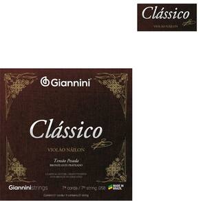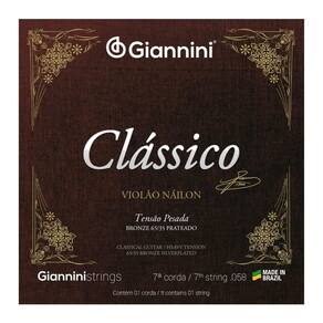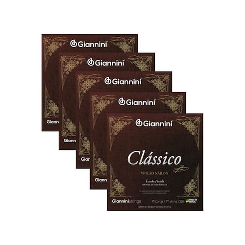 Kit 5 Cordas Violão Nylon 7ª corda Giannini Genwpa.7 Bronze 65/35 PesadoA série Clássico é indicada para quem aprecia um som puro e cristalino no seu instrumento com encordoamento náilon. Revestidas com Bronze 65/35, a Giannini Clássico GENWPA é a melhor para o seu instrumento sete cordas, com uma pegada pesada.Diferenças entre as séries Clássico x TitaniumA diferença entre as séries Clássico e Titanium está basicamente nos materiais utilizados (nas cordas primas “lisas” monofilamento, e nos bordões revestidos com Bronze), que afetam a sonoridade em cada série: Podemos dizer que para o encordoamento Clássico temos um timbre equilibrado, com ótima definição e boa sustentação, o que corresponderia à expectativa de quem deseja um som mais “tradicional” de um violão clássico.