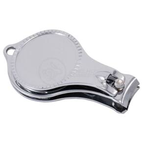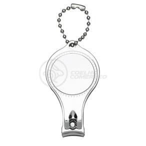 Cortador de unhas chaveiro de metal 3 em 1: abridor, cortador e lixa. Parte central circular ideal para gravações, detalhe de traços no contorno circular. Lado frontal com detalhes em relevo nas laterais e pequeno círculo acima do abridor. Para utilizar o cortador basta rotacionar a peça circular e levantá-la. Acompanha correntinha.